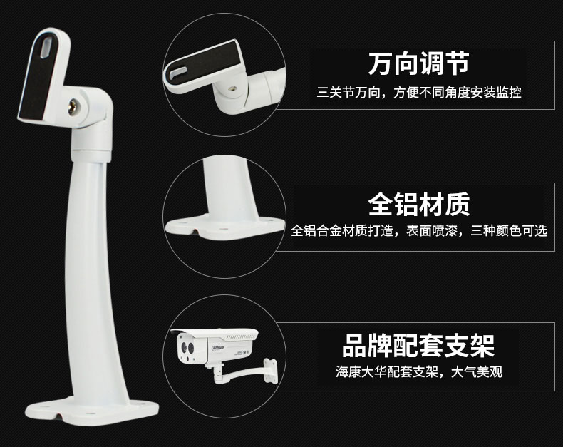 描述:监控鸭嘴支架全铝 鸭嘴支架/大型加厚铝支架*摄像机支架*全铝合金,全铝鸭嘴支架,高度30cm,很稳,不会摇晃。